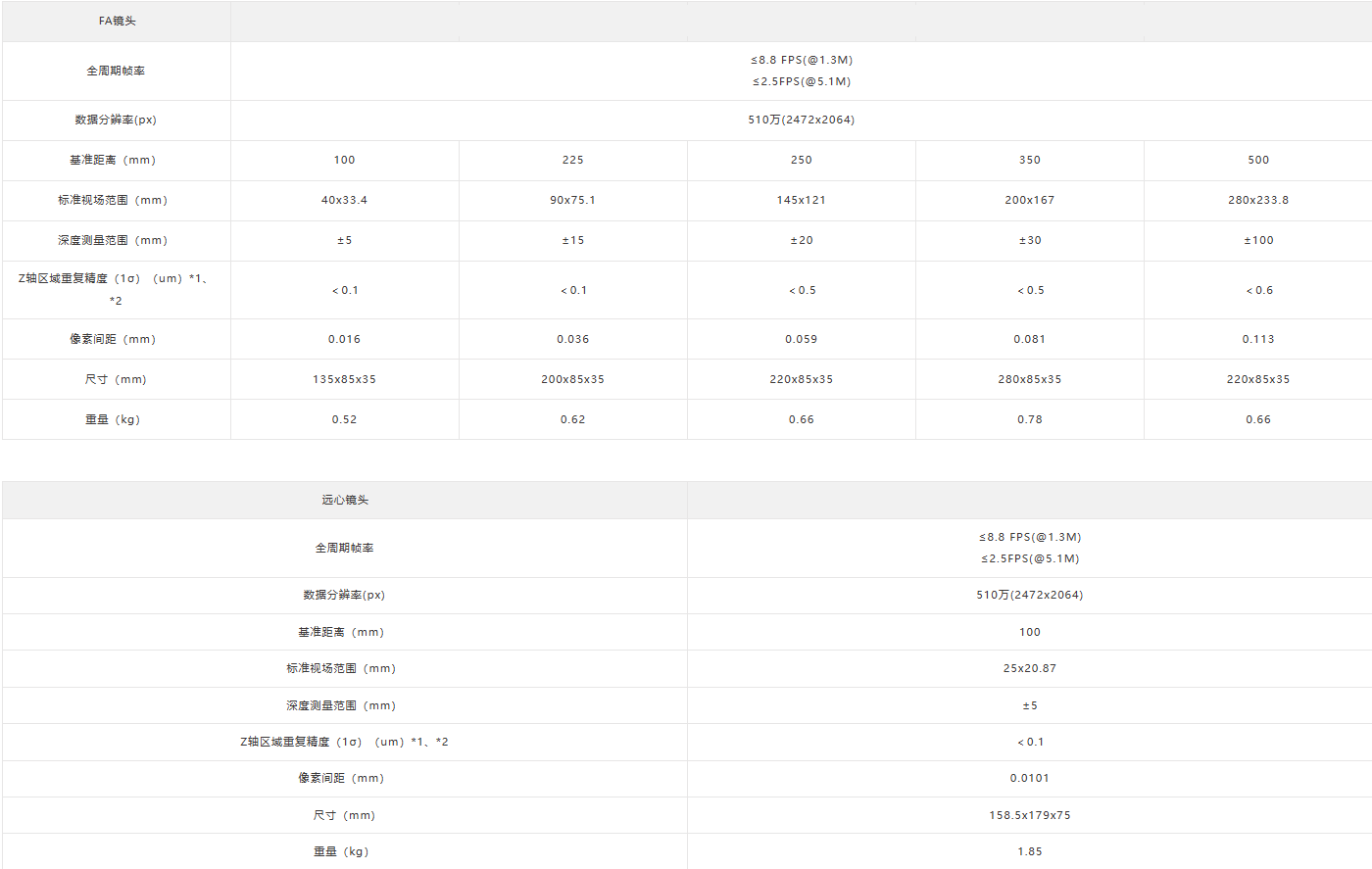 擁有一手掌握超小體型的同時還擁有著不凡的綜合實力。數(shù)據(jù)分辨率可達510萬像素(2472x2064px),最高幀率可達8.8FPS,Z軸區(qū)域重復(fù)精度小于0.6um。